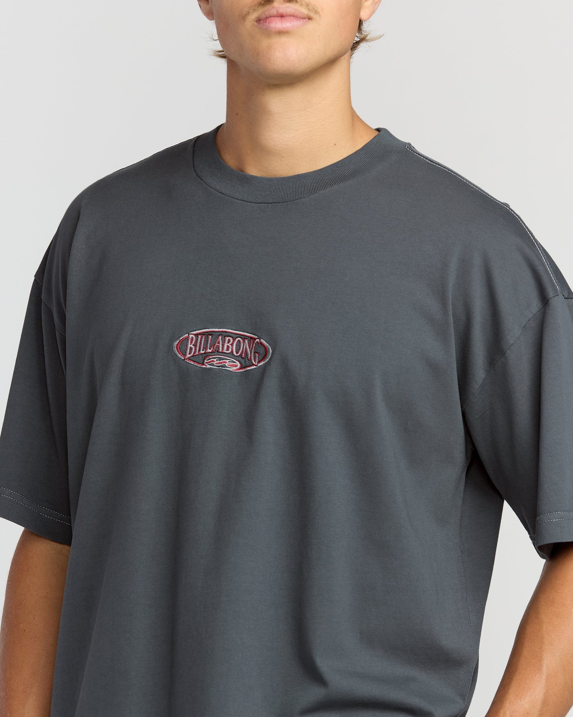 Our throwback cotton tee brings back the oversized fit you love, with wider shoulders and longer sleeves. Garment-washed for extra softness, it features a screen-printed design with contrast stitching. Featured here in the Blue colorway.