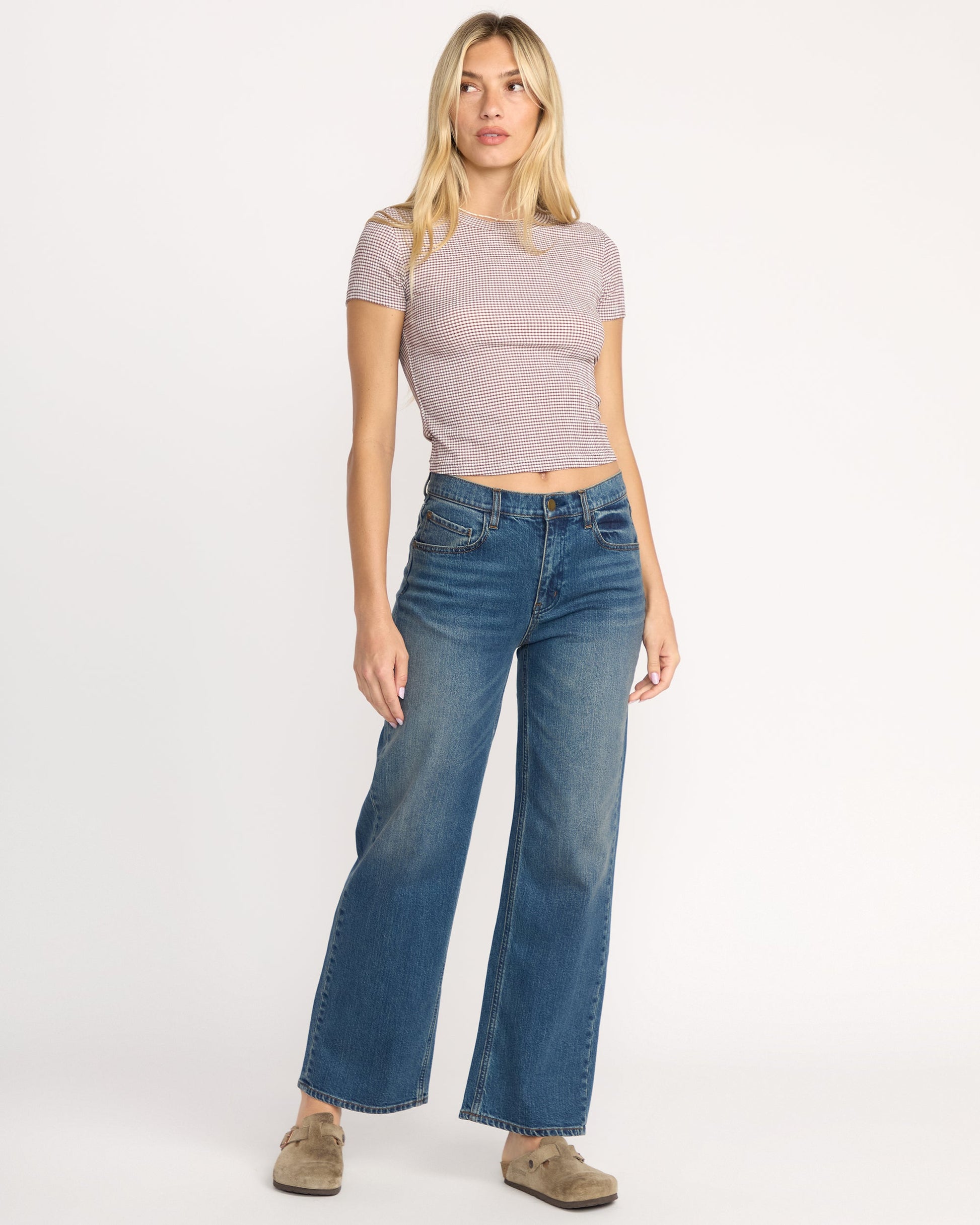 A fitted baby tee that hugs in all the right places. Our crew neckline style features a yarn-dyed check pattern and sleek metal plate detail for an extra dash of cool-girl charm. Featured here in the Brown colorway.