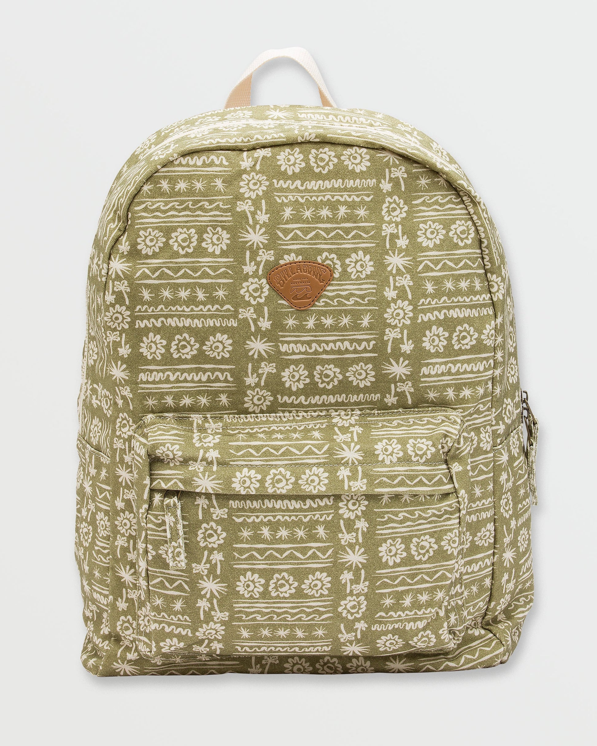 Cotton canvas takes this 20L Billabong backpack from school mode to weekend adventure companion. Interior laptop sleeve keeps tech secure while padded shoulder straps offer all-day comfort. Vegan leather patch branding elevates the large main compartment and front zip pocket design. Featured here in the Green Tea colorway.